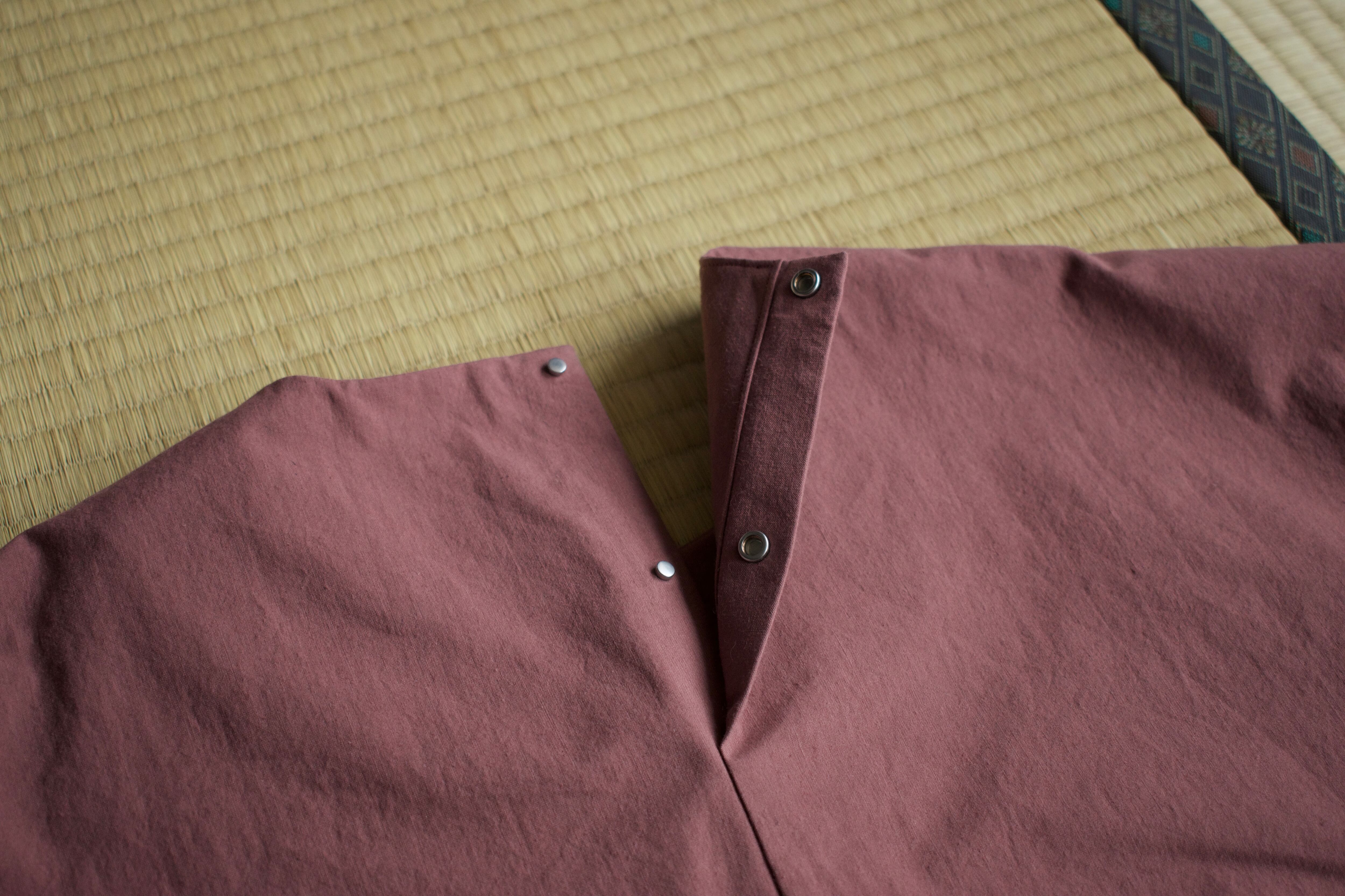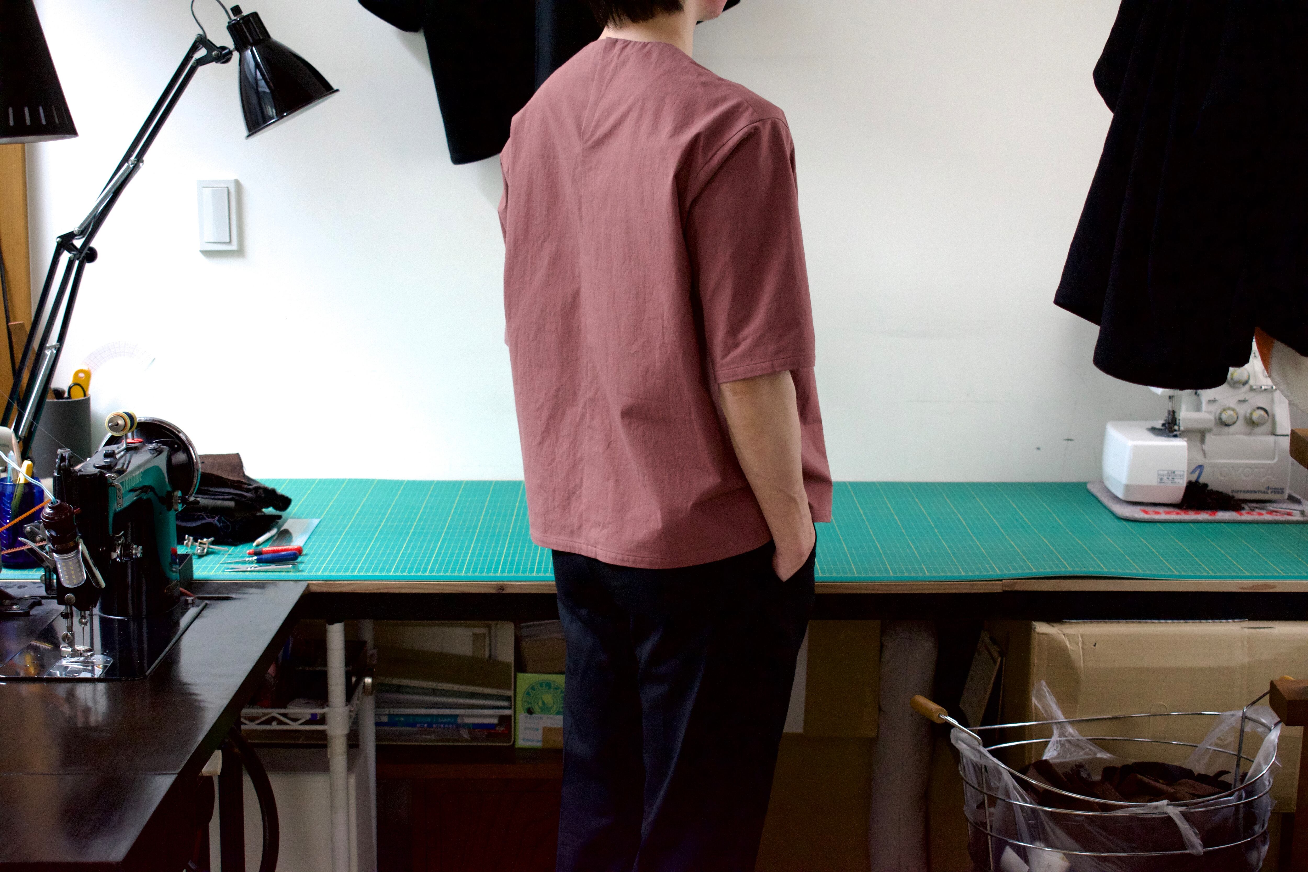 なるべくフォーマル寄りな印象にするため、襟は無いながらもドレスシャツのようにネックラインを可能な限り首の付け根に沿わせることにより、首元のカジュアルさを減らしました。
