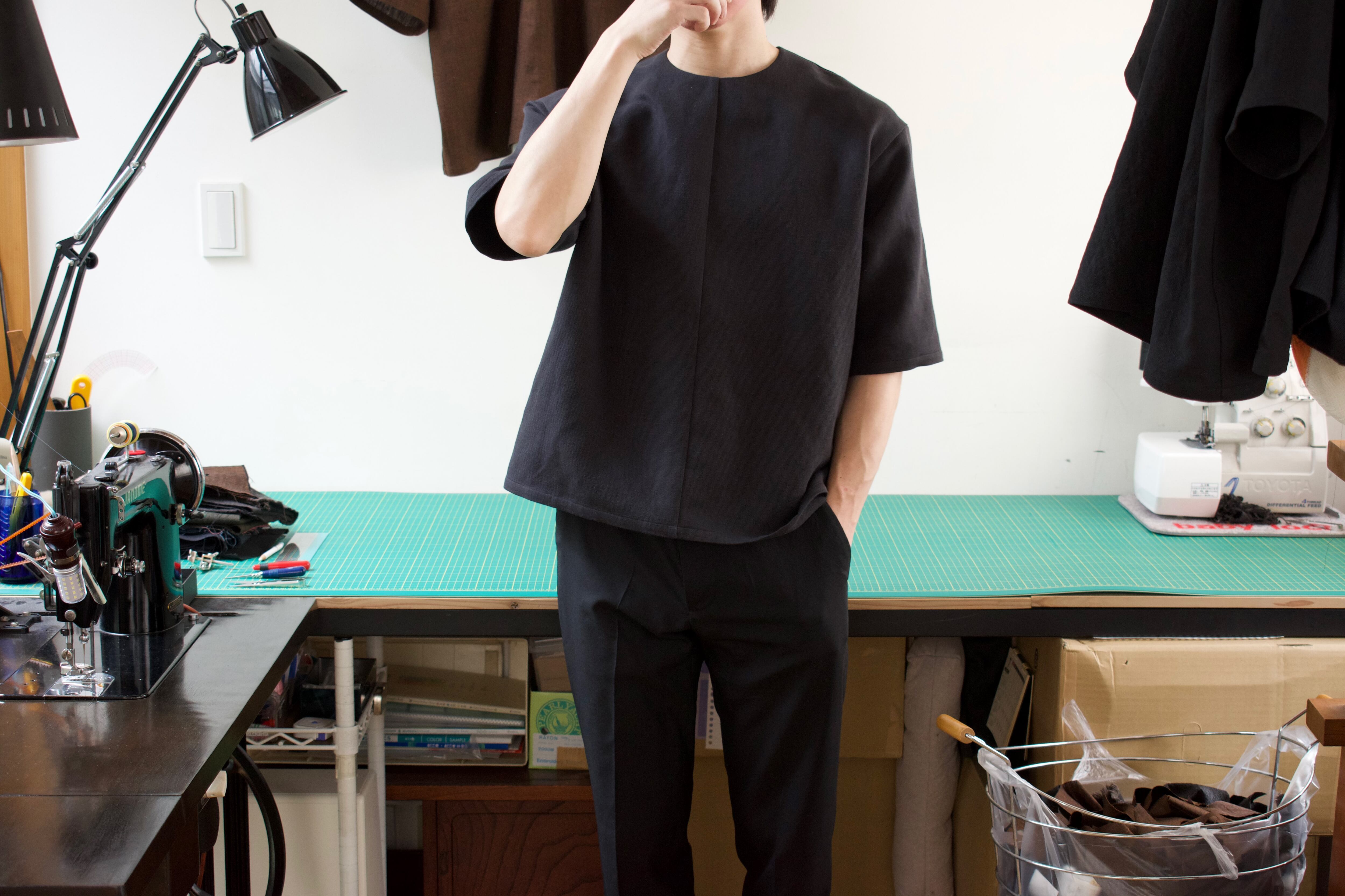 ルーズで丸みのあるシルエットは多少カジュアルな印象があったため、全体のシルエットが四角い印象になるよう、袖口幅を狭くして袖が外側にはねないようにし、身頃に余計なドレープが出ないよう身幅もいつもよりほんの少しだけ狭く。