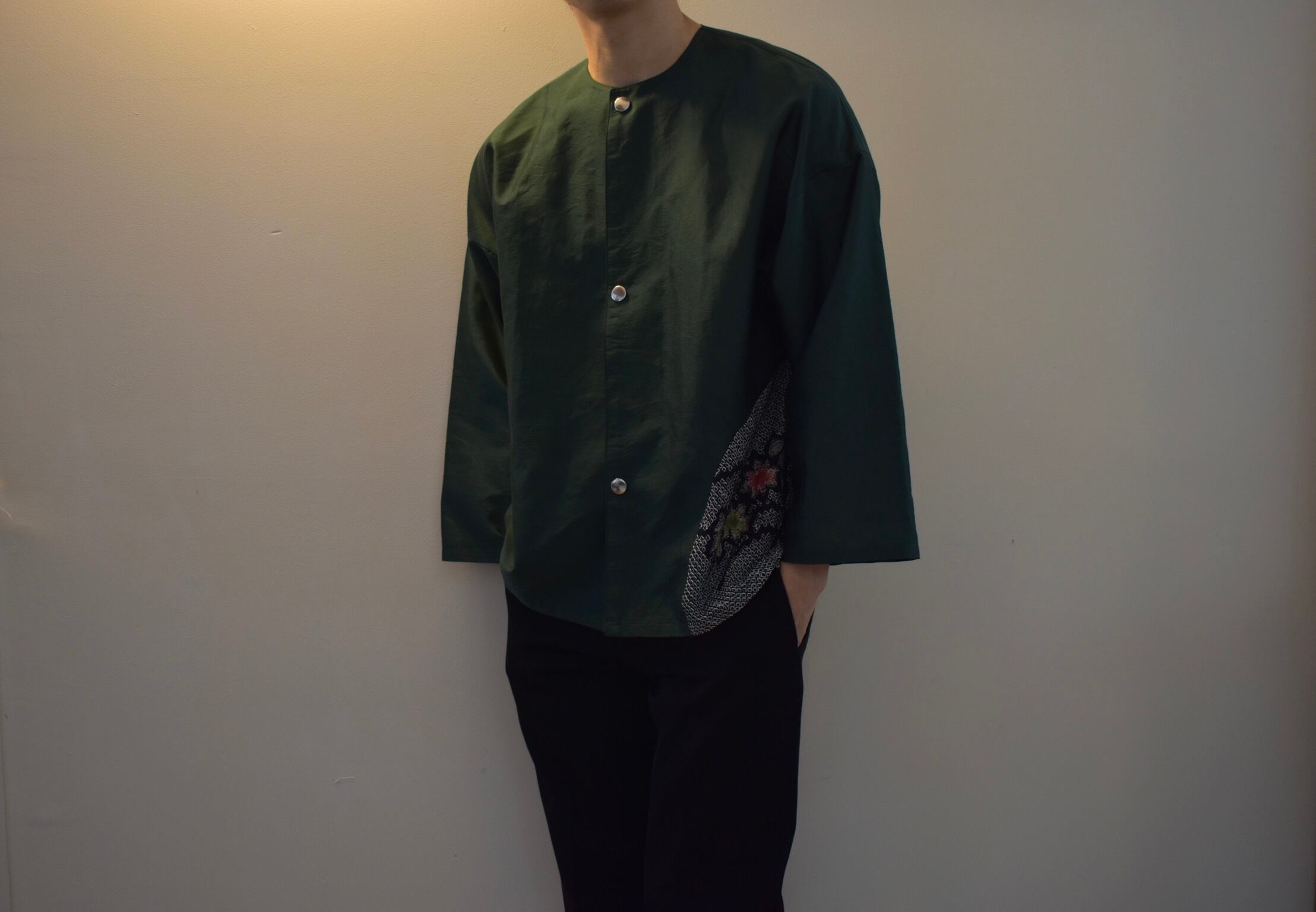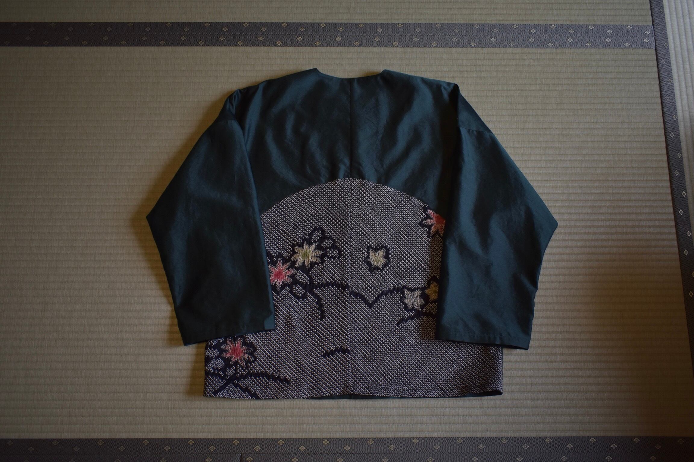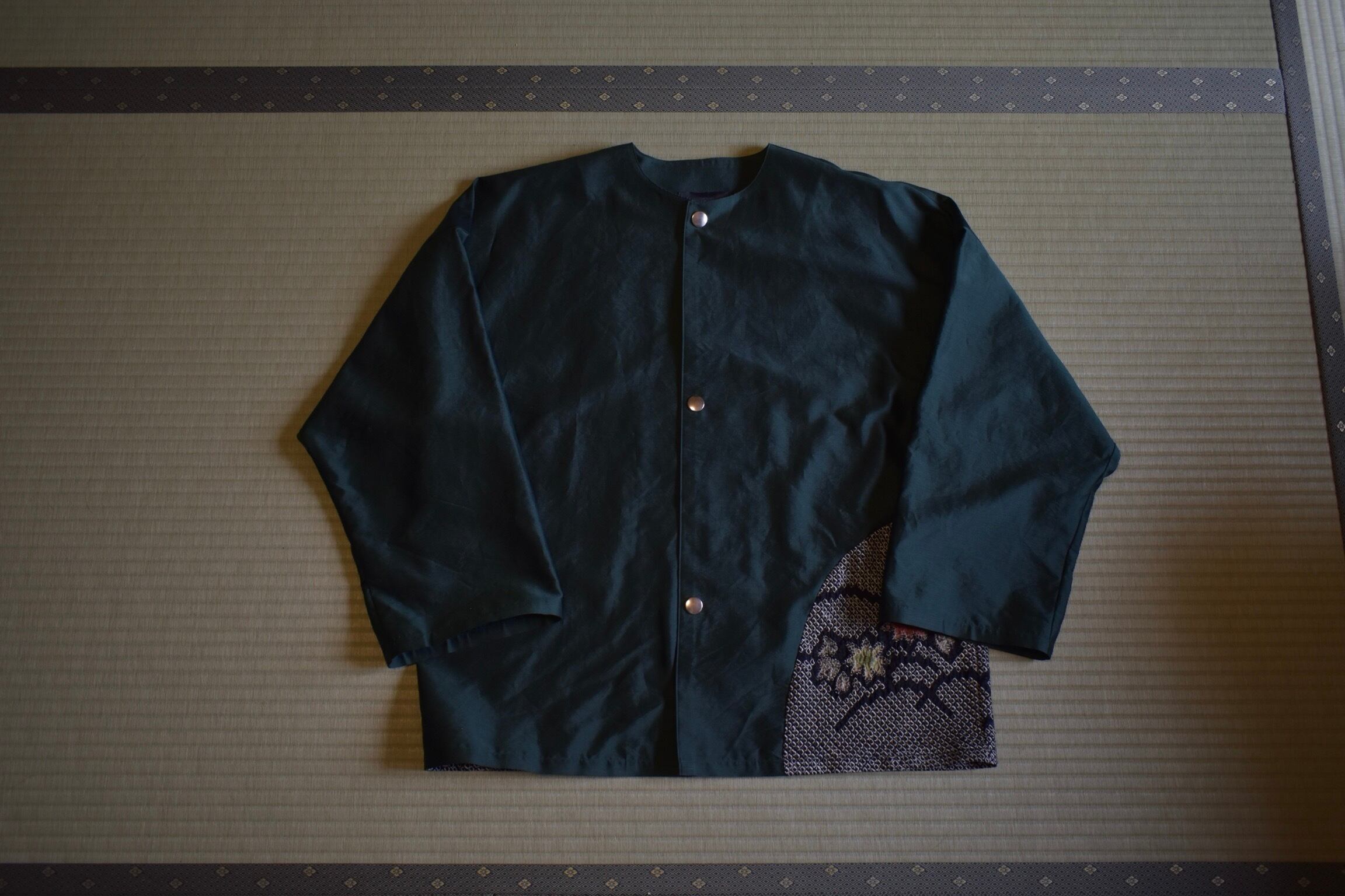 ほんの少し光沢感のある綿シルクの生地に古着の着物素材を切り替えた一点物のアイテムになります。