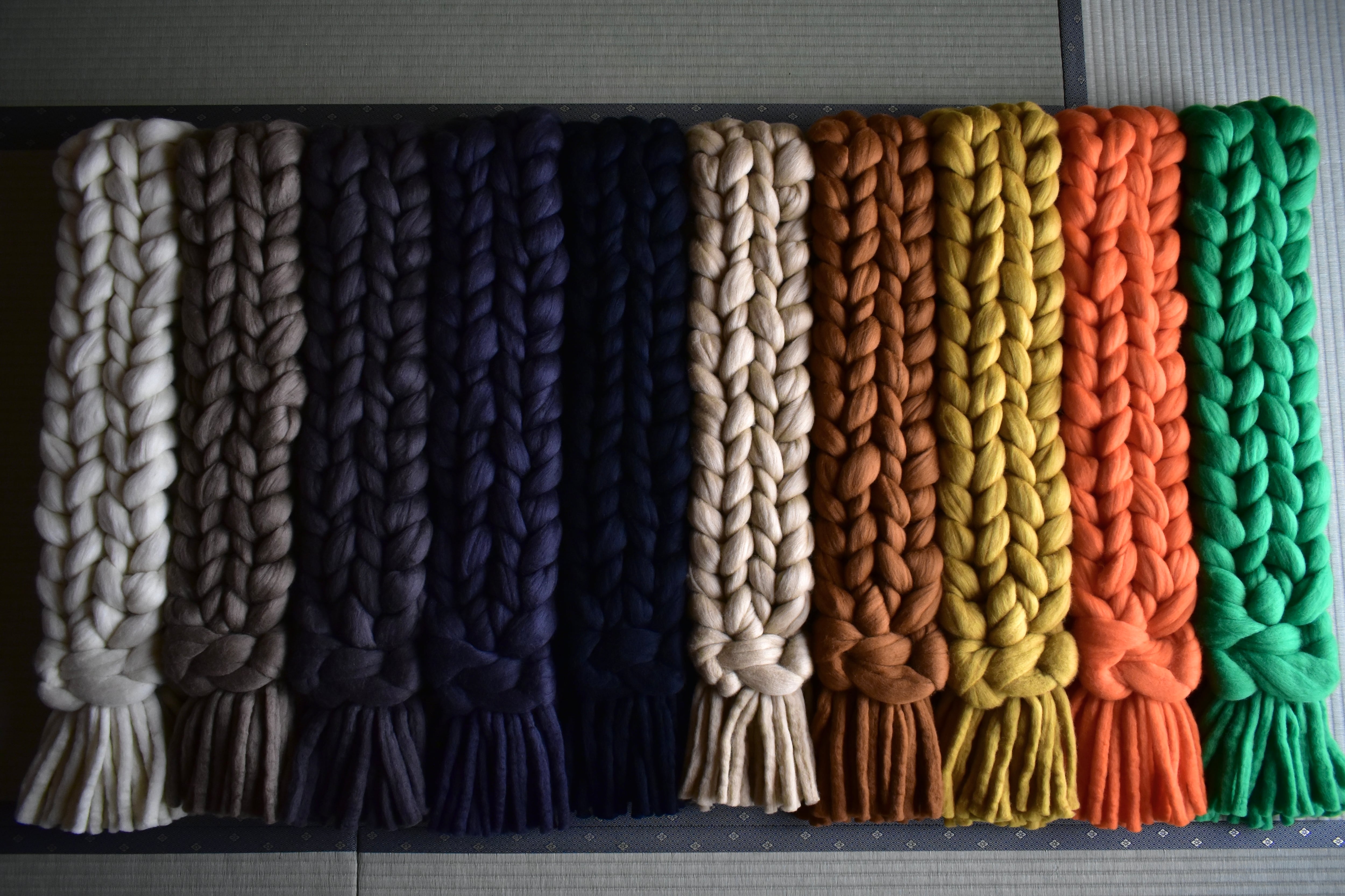通常はこのトップを更に加工して様々なニット製品に仕上げていくのですが、チャンキーヤーンはこのトップの段階で超極太の毛糸製品として成立させています。