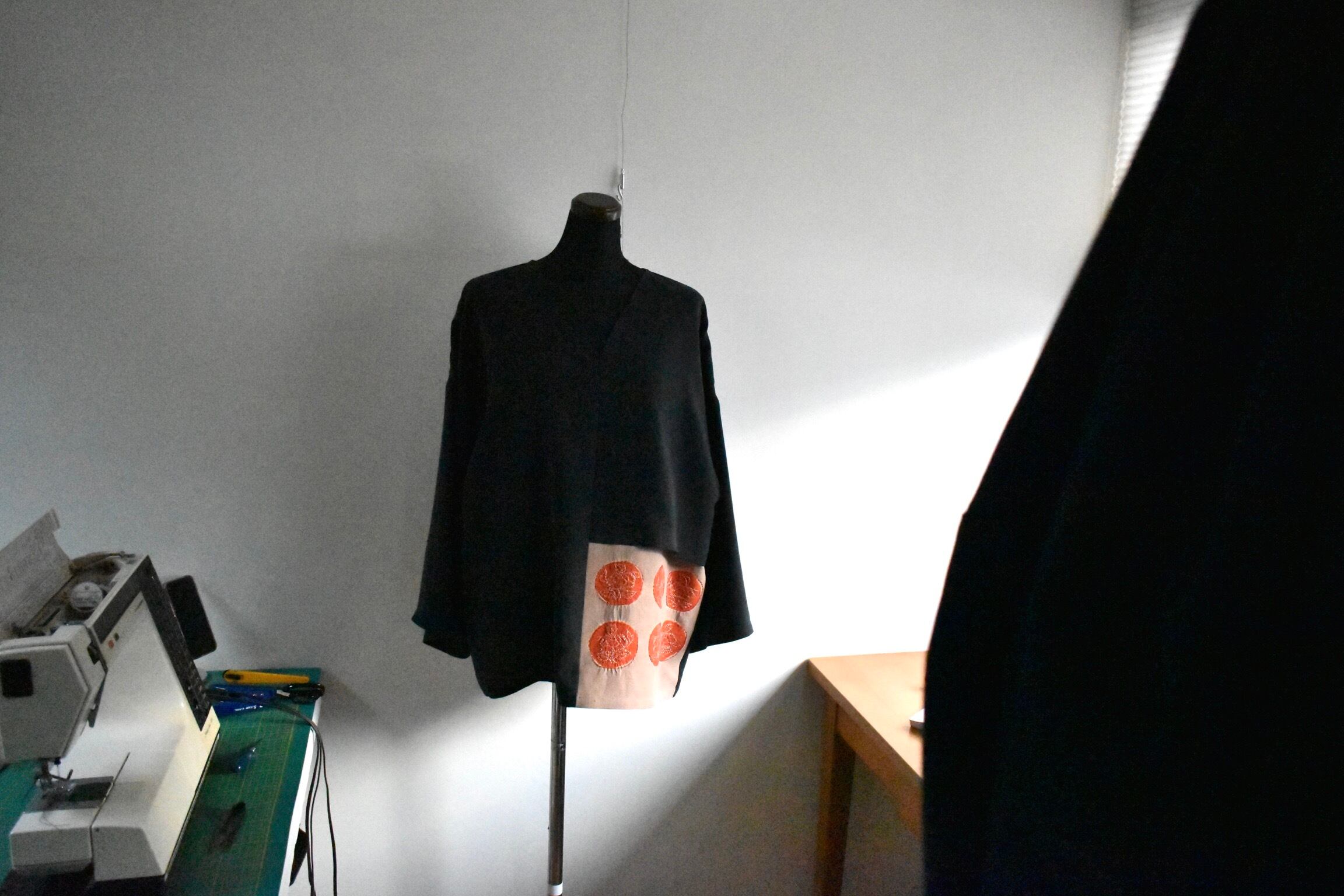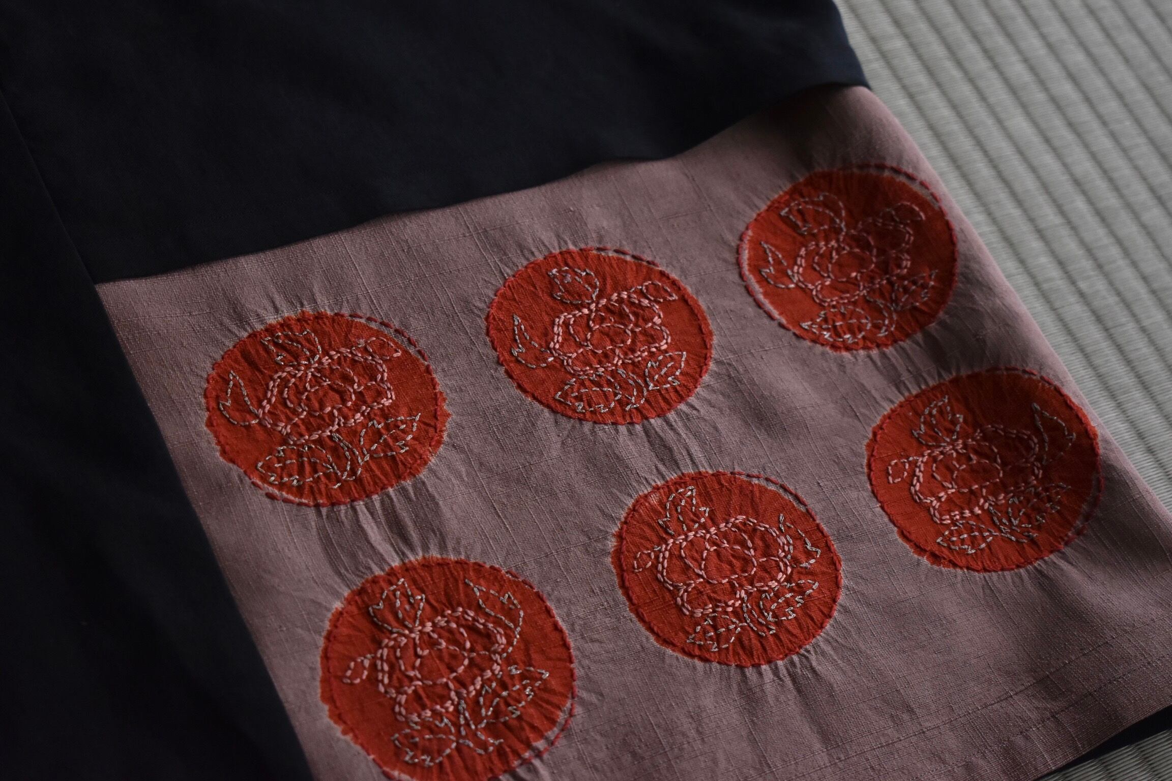 まるくオレンジに染められた生地部分にお花の刺繍が施されている古着の着物の帯を合わせました。