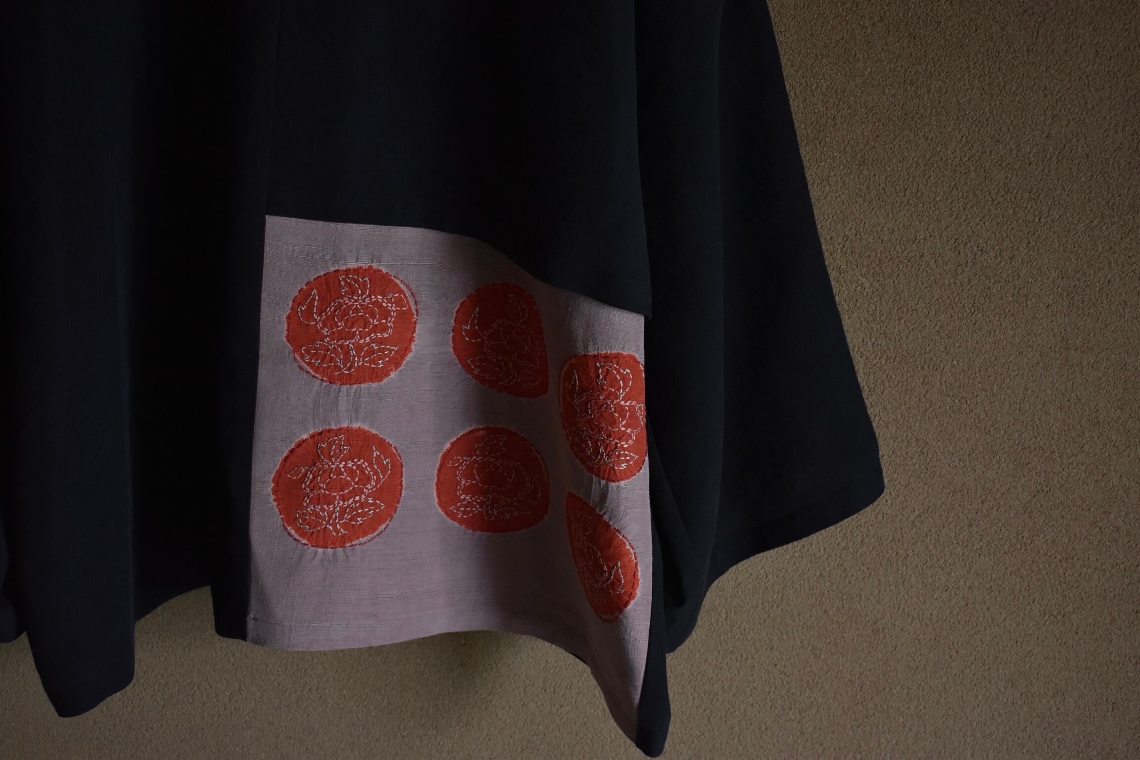 柔らかさのあるとろっとした質感、そして優しさのある墨黒色の綿・テンセルの布に、古着の着物の帯を合わせた一品。