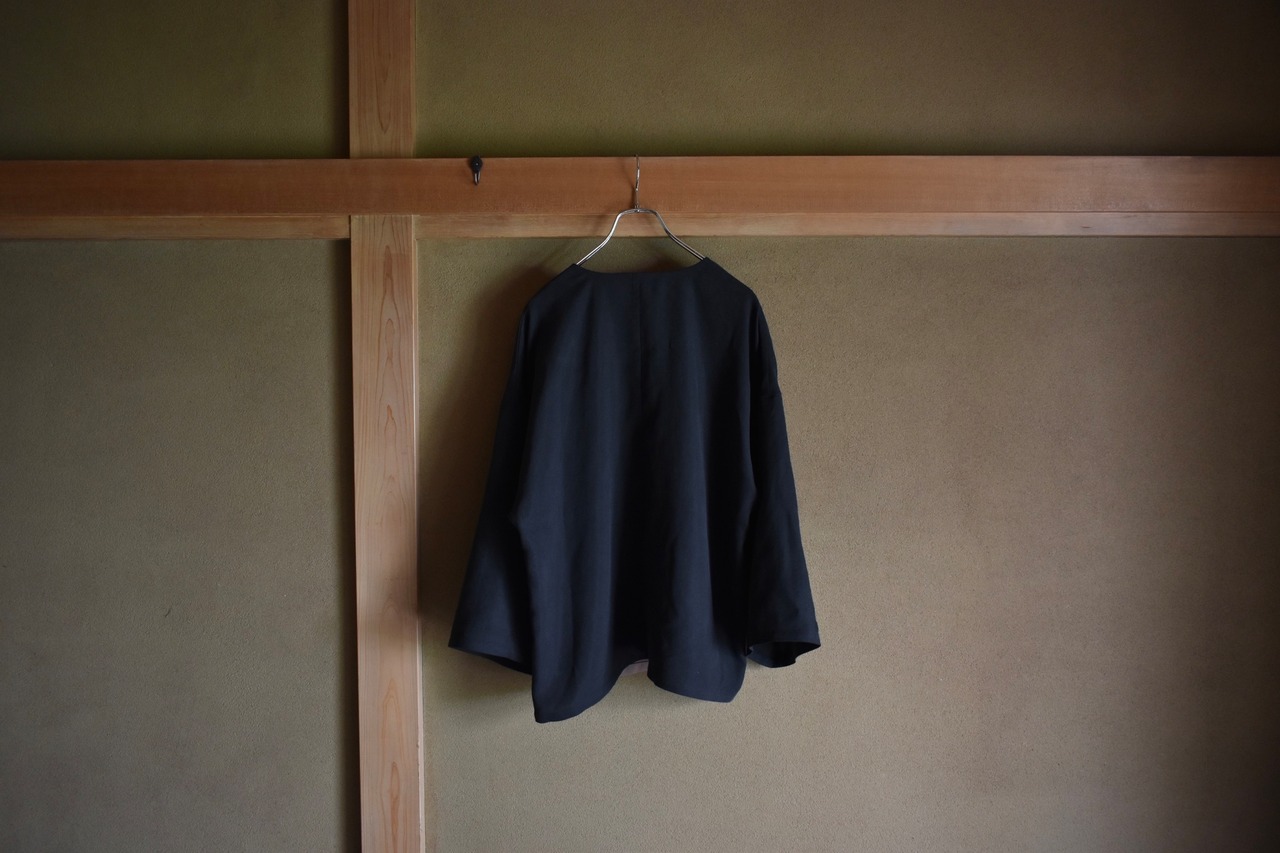 広すぎないVネックと四角く広くとった袖が和服の面影を少し。