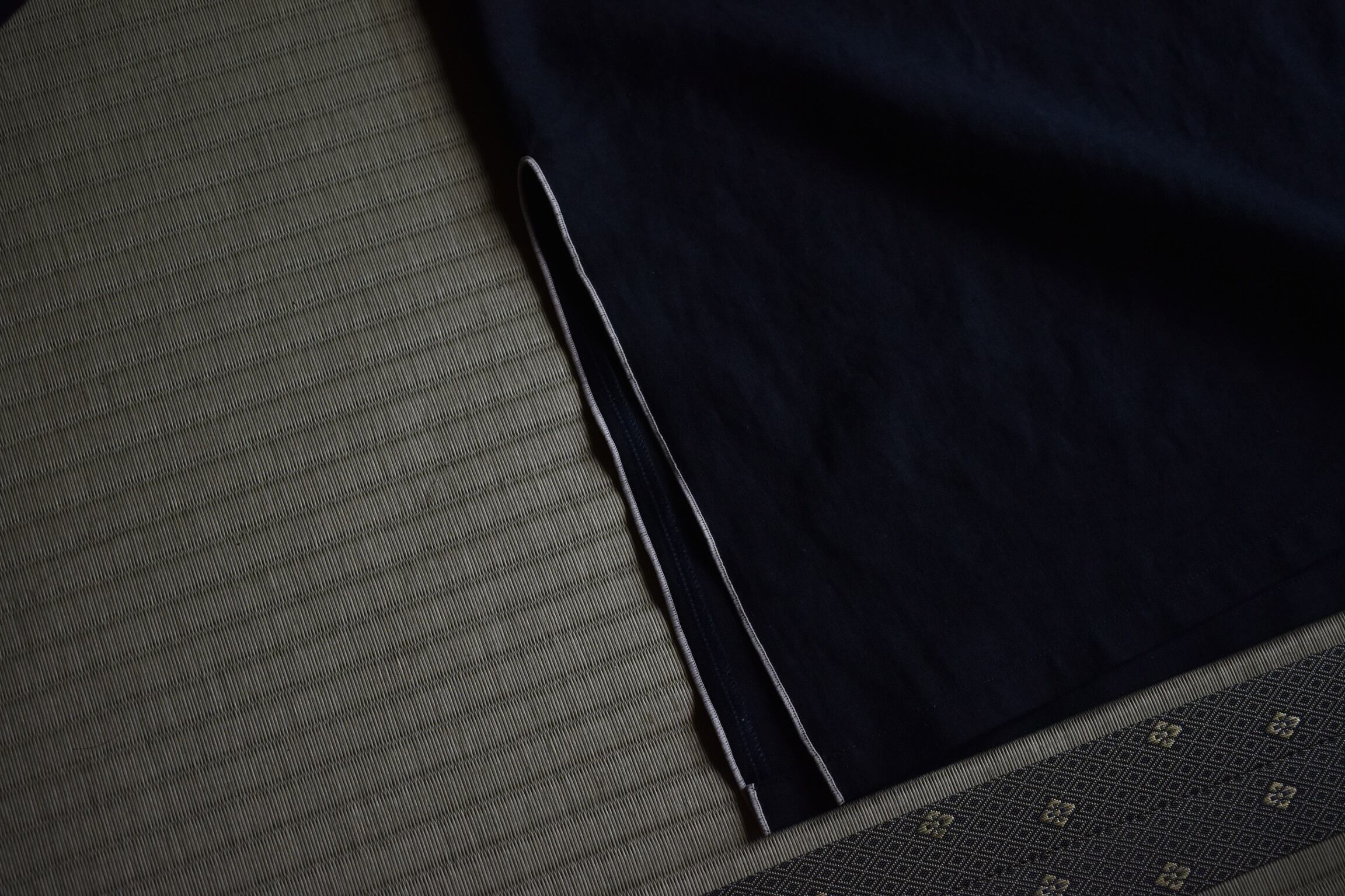 綿麻の柔らかな濃紺色の生地に生成の糸を合わせた一品。