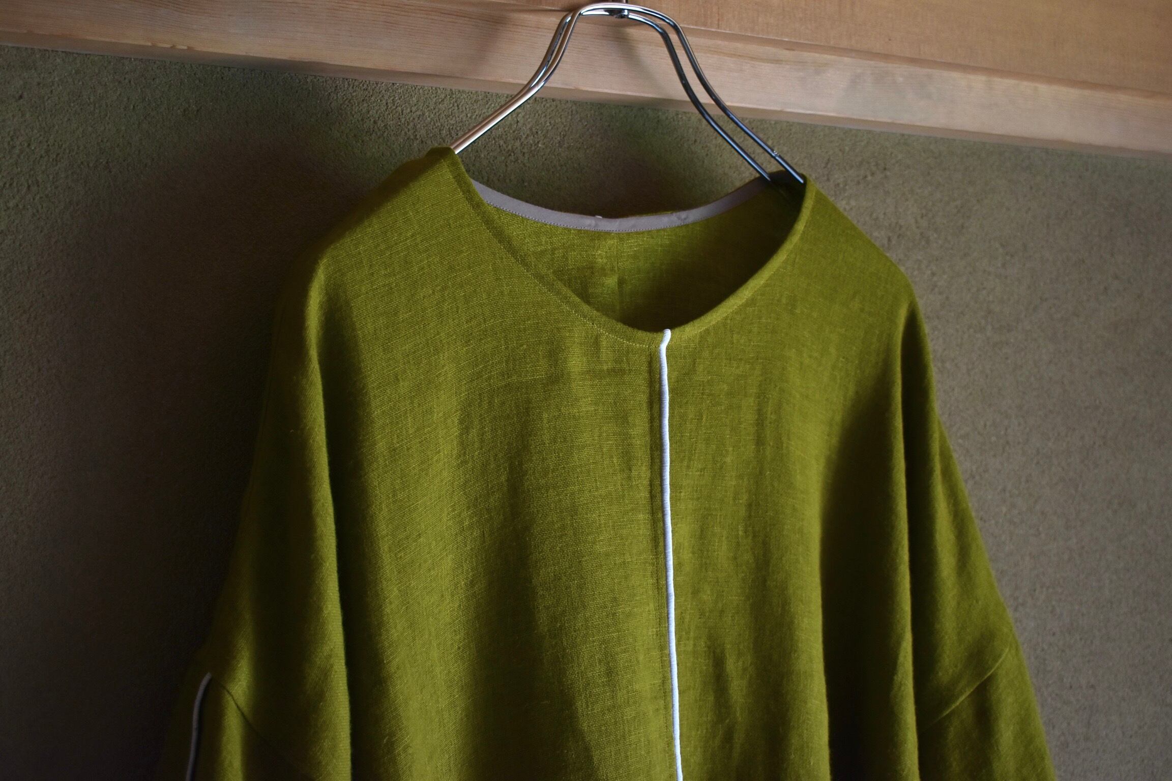 綿麻のふわっとした柔らかな若草色のダブルガーゼ生地に生成の糸を合わせた一品。