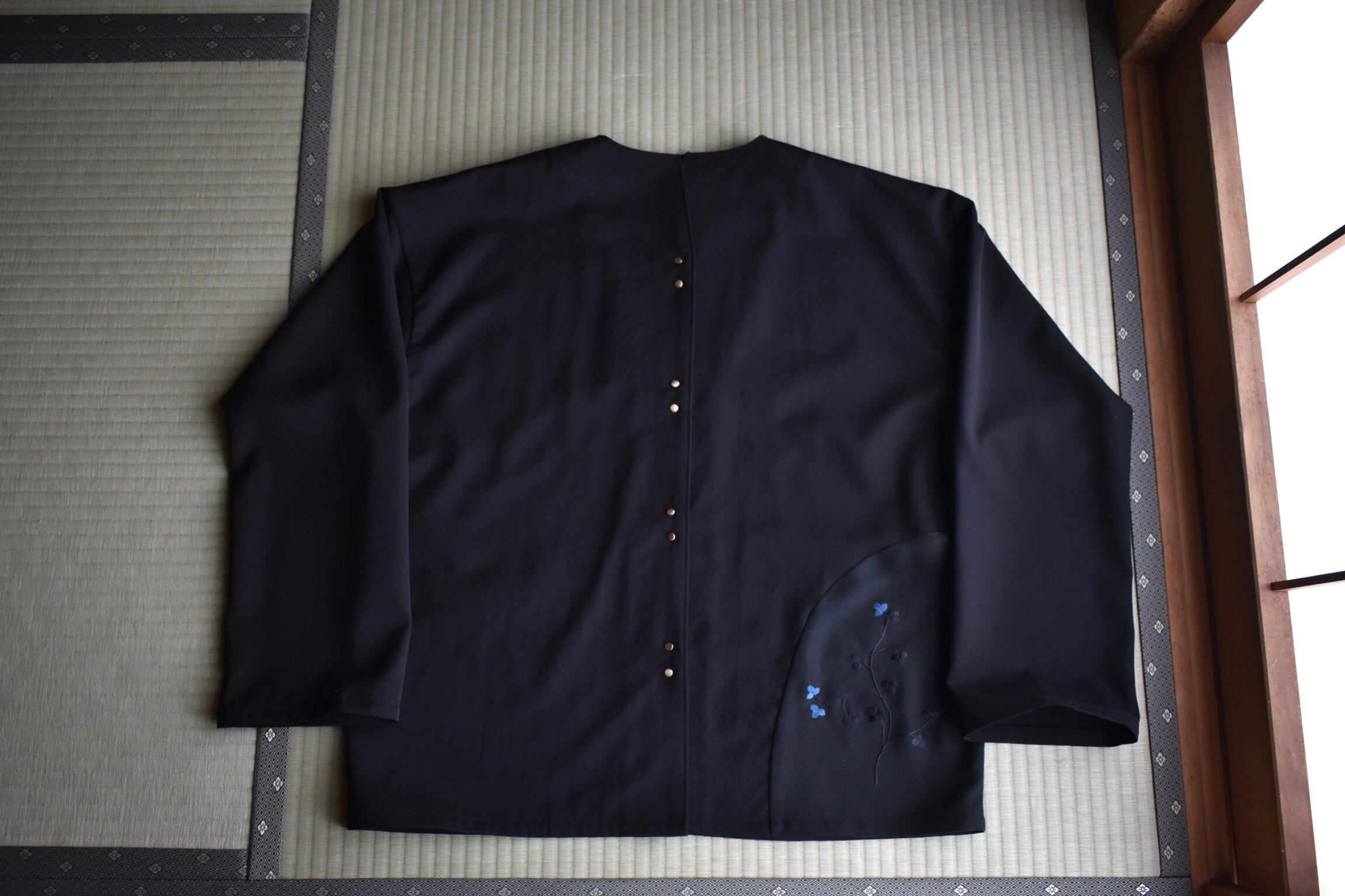 あまり見かけない、青くてまあるいお花の刺繍が施された古着の着物を合わせた一点物になります。