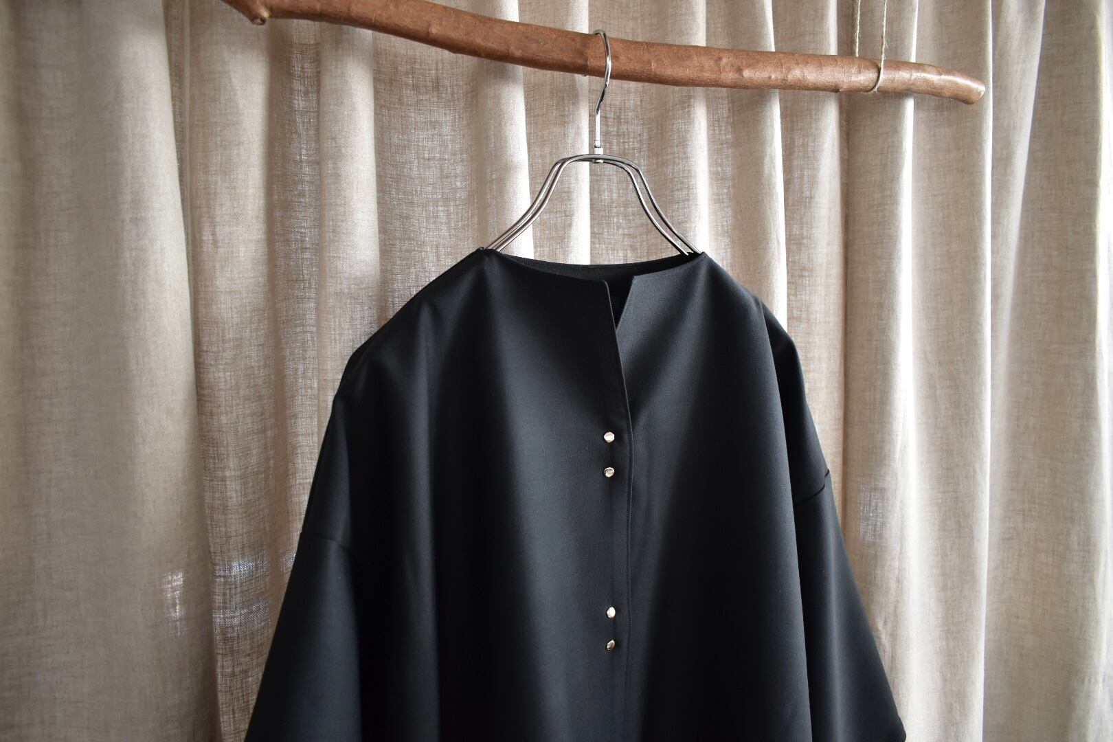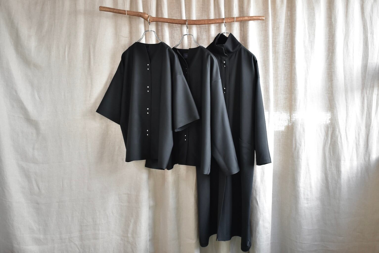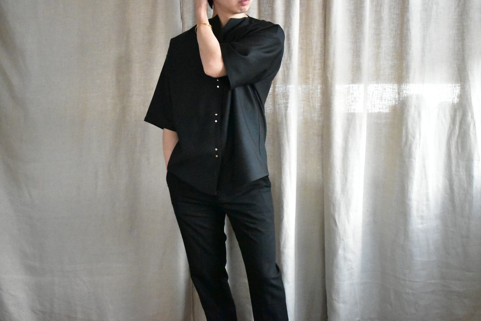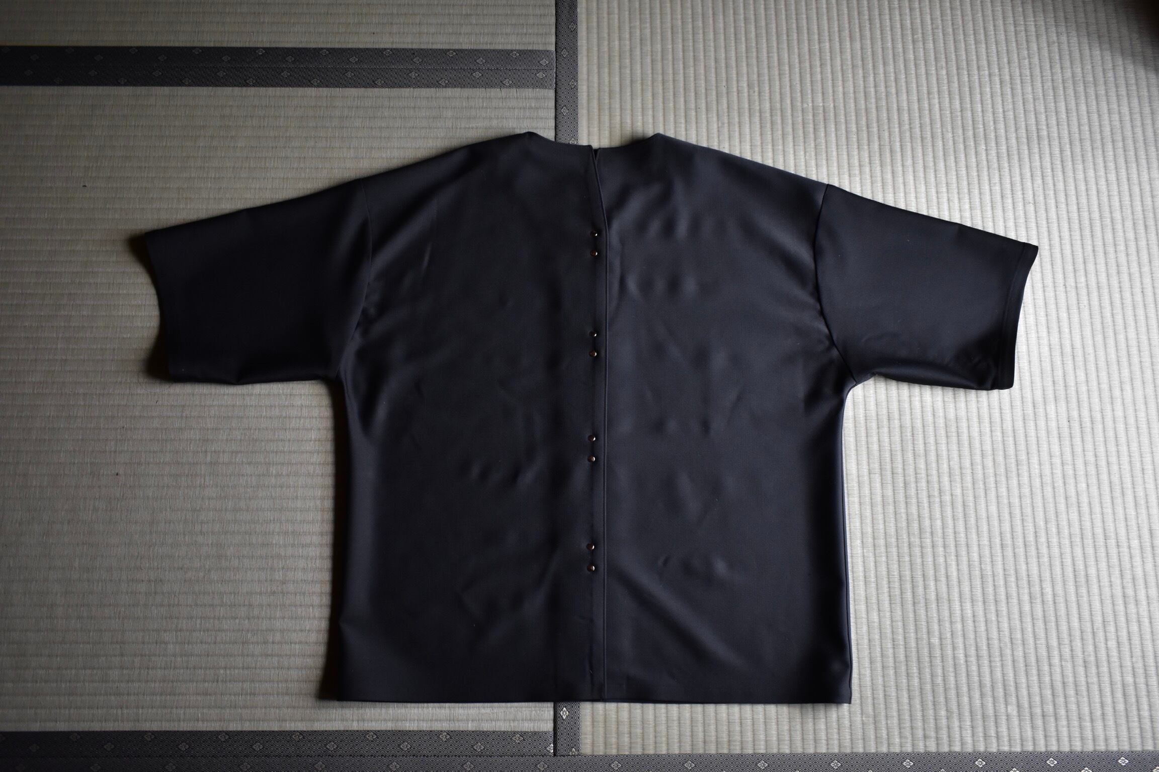 フロント開閉部分に金属製のシルバーのホックを使用した半袖のシャツ。