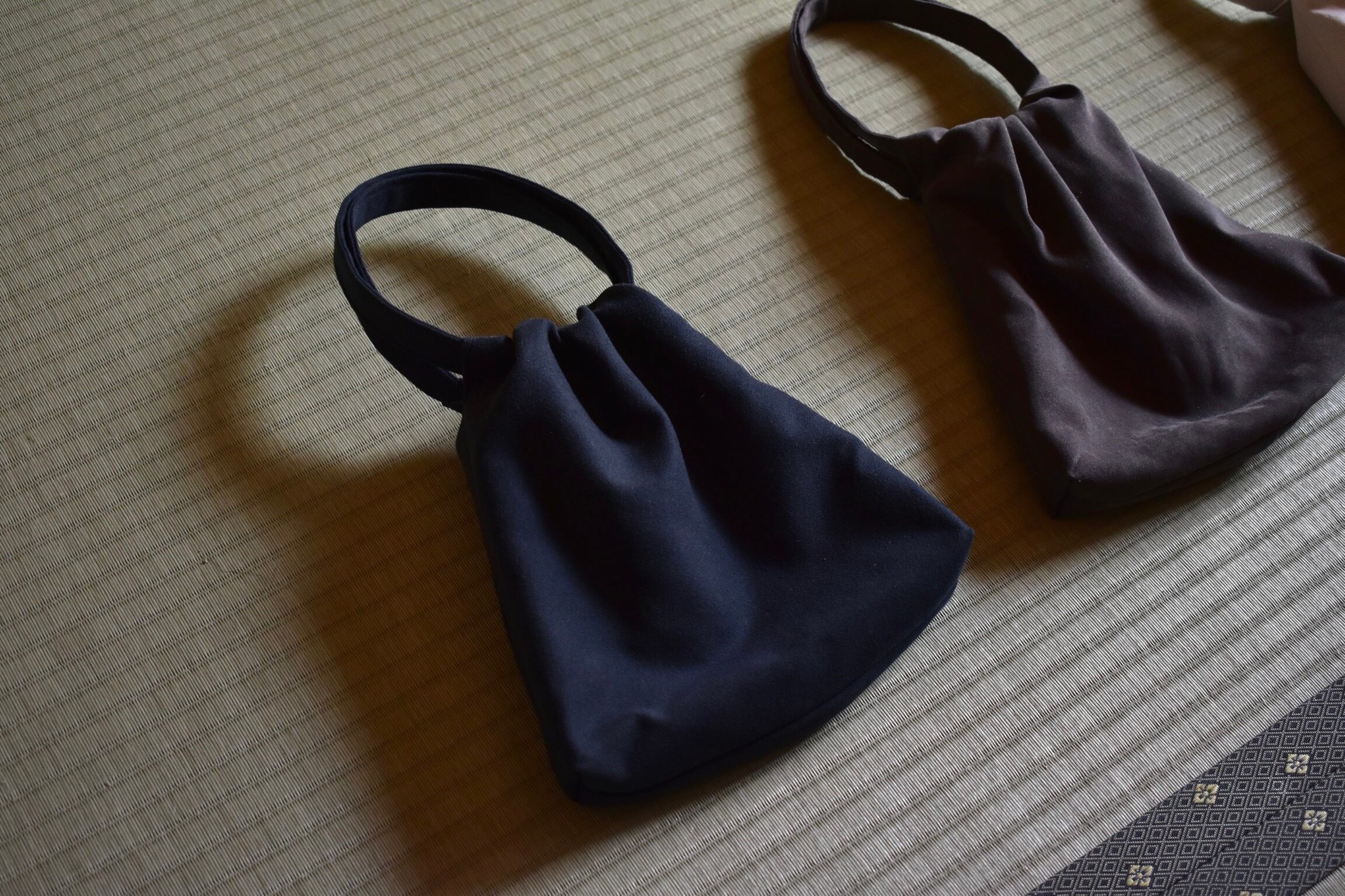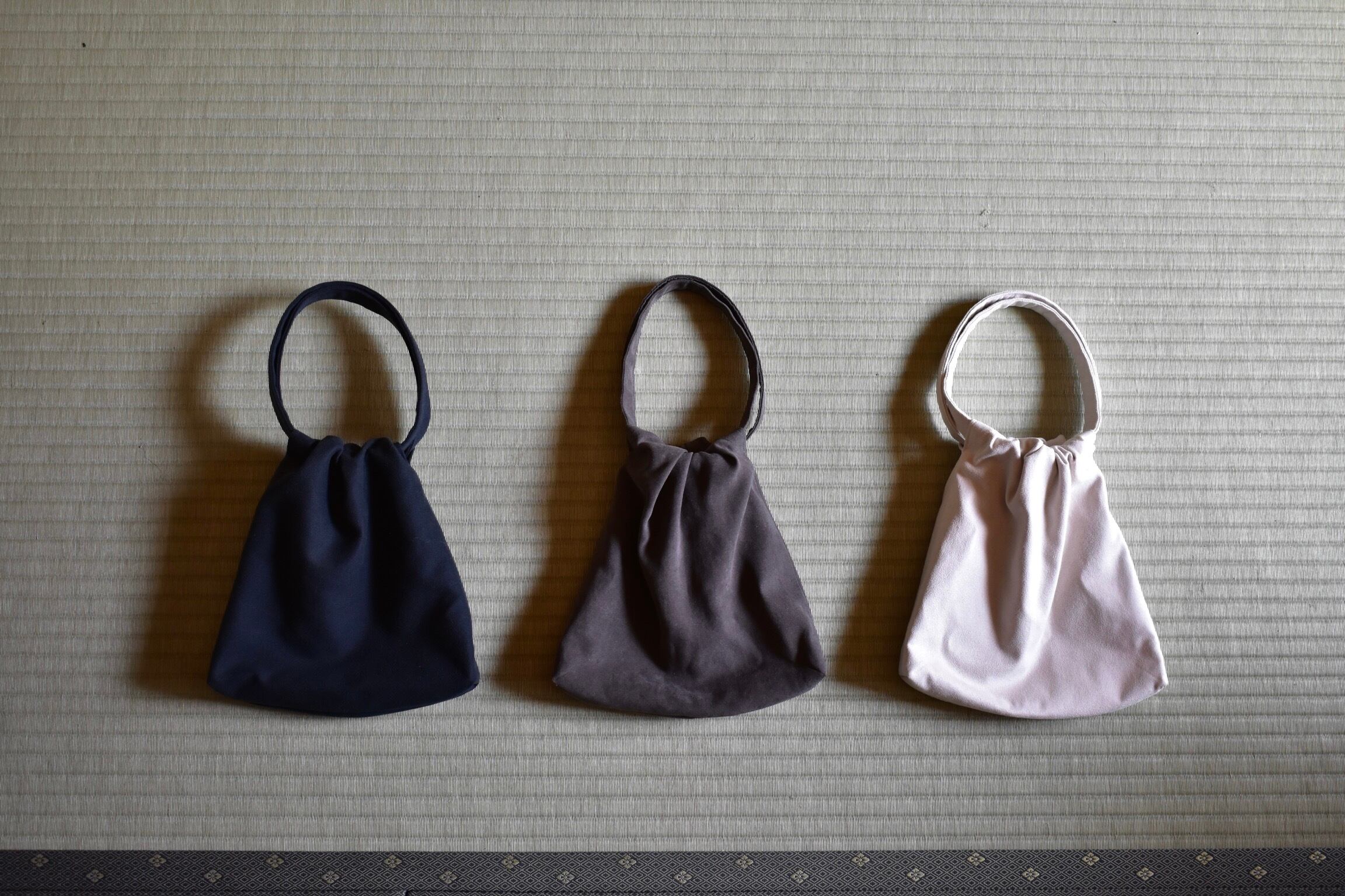・鞄の口を絞る際に持ち手を強く引っ張ってしまうと、革や縫い糸に負担がかかってしまいます。お使いの際は持ち手をやさしく引っ張って、生地を寄せるようにしてお使いください。