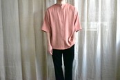 フロント開閉部分に金属製のシルバーのホックを使用した半袖のシャツ。