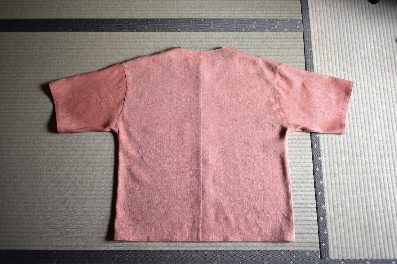 白の経糸とオレンジの緯糸で織られた生地は少し離れて見ると薄いピンクのような色合いに感じとれます。