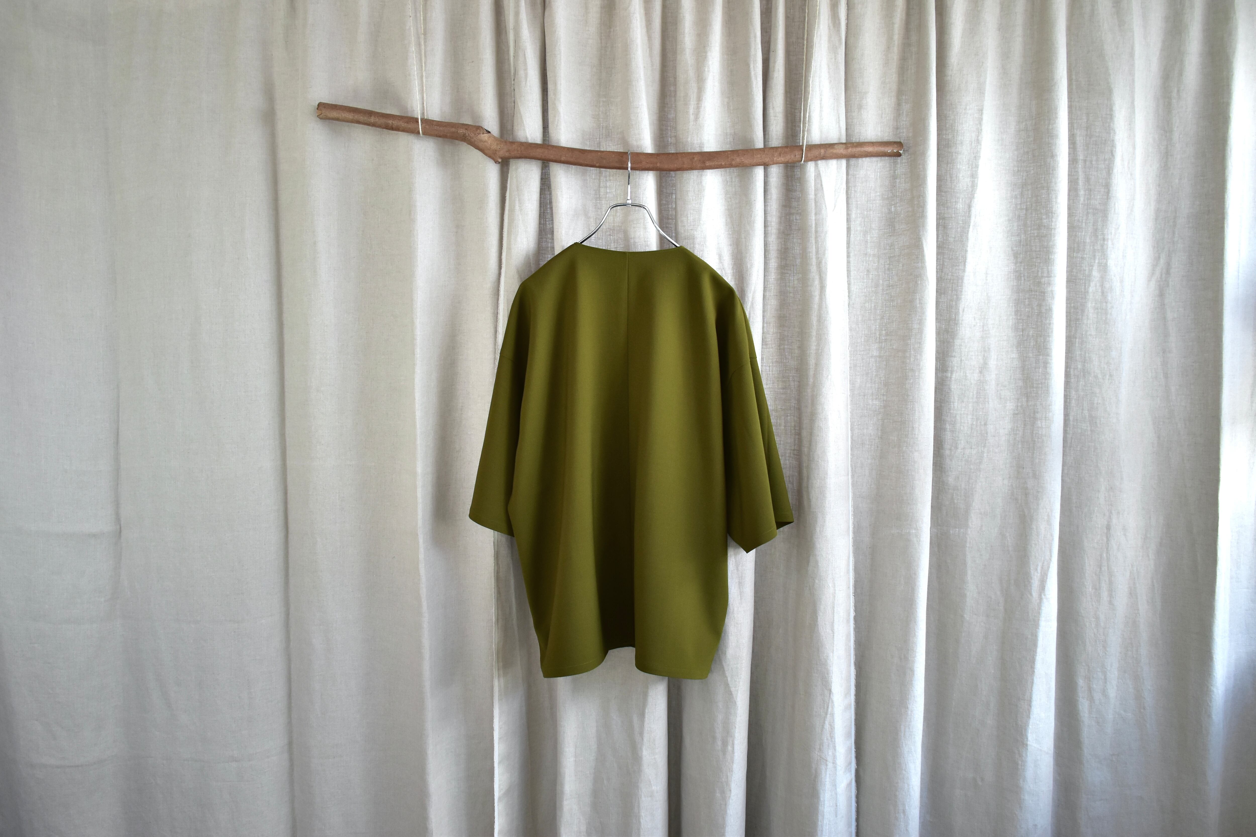 今回使用した濃い黄緑色の生地は、ある程度しっかり感がありながらもハリ感は無く、やさしく体に寄り添うような柔らかい生地感となります。