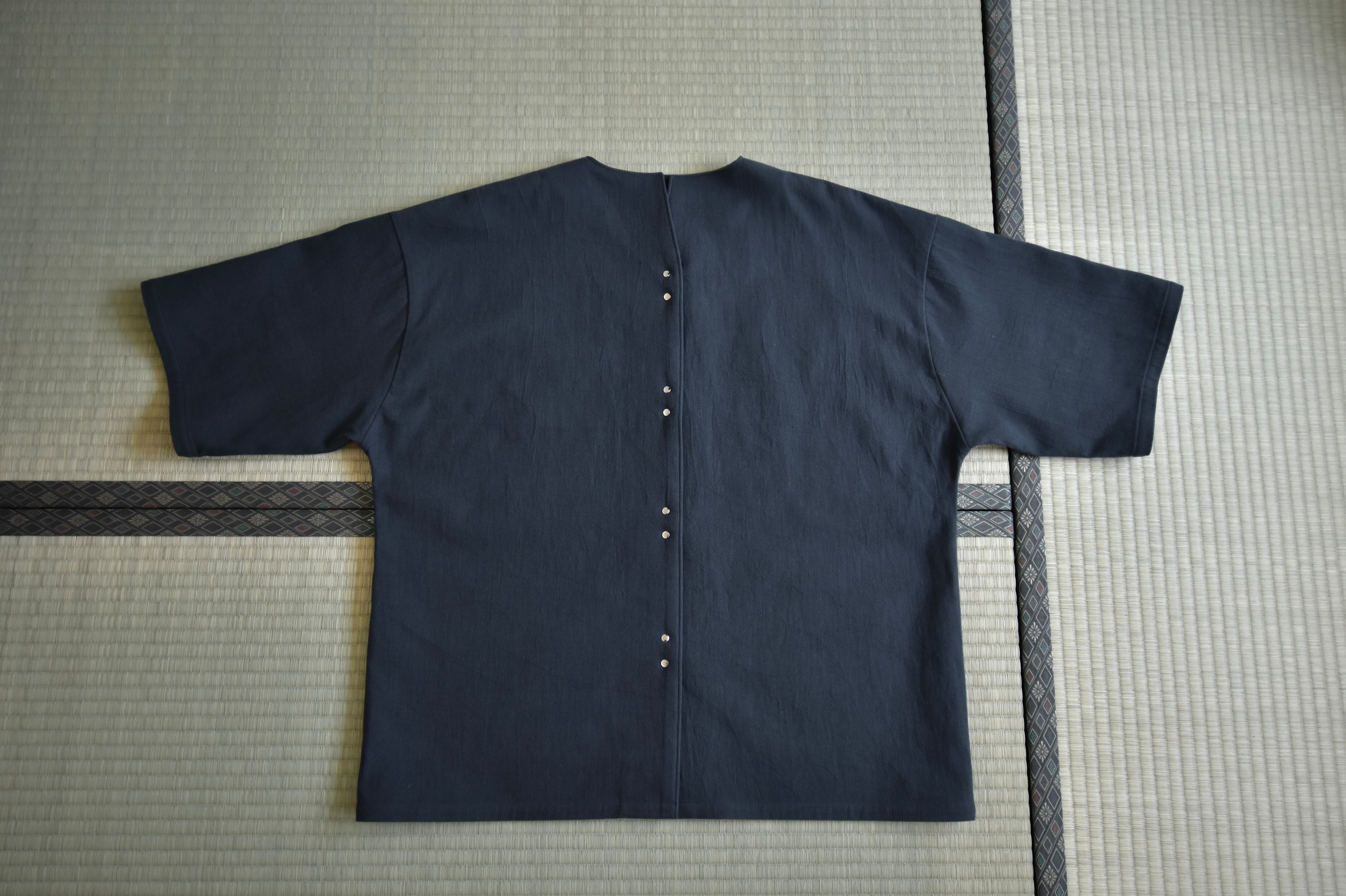 フロント開閉部分に金属製のシルバーのホックを使用した半袖のシャツ。